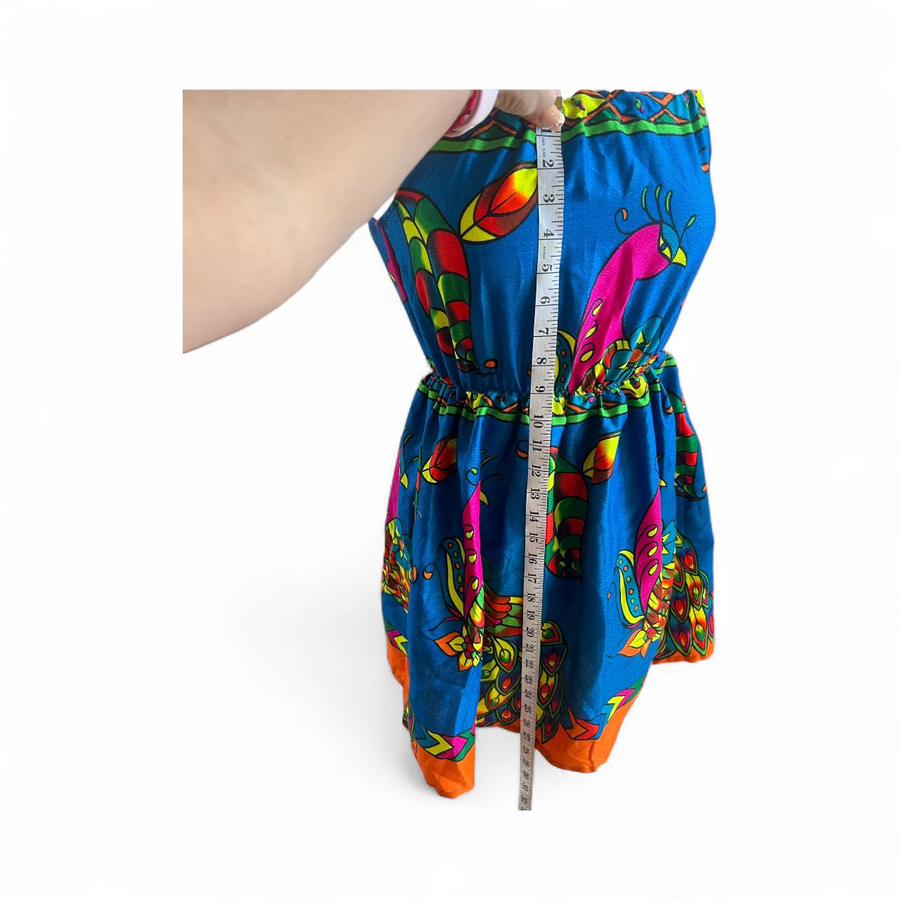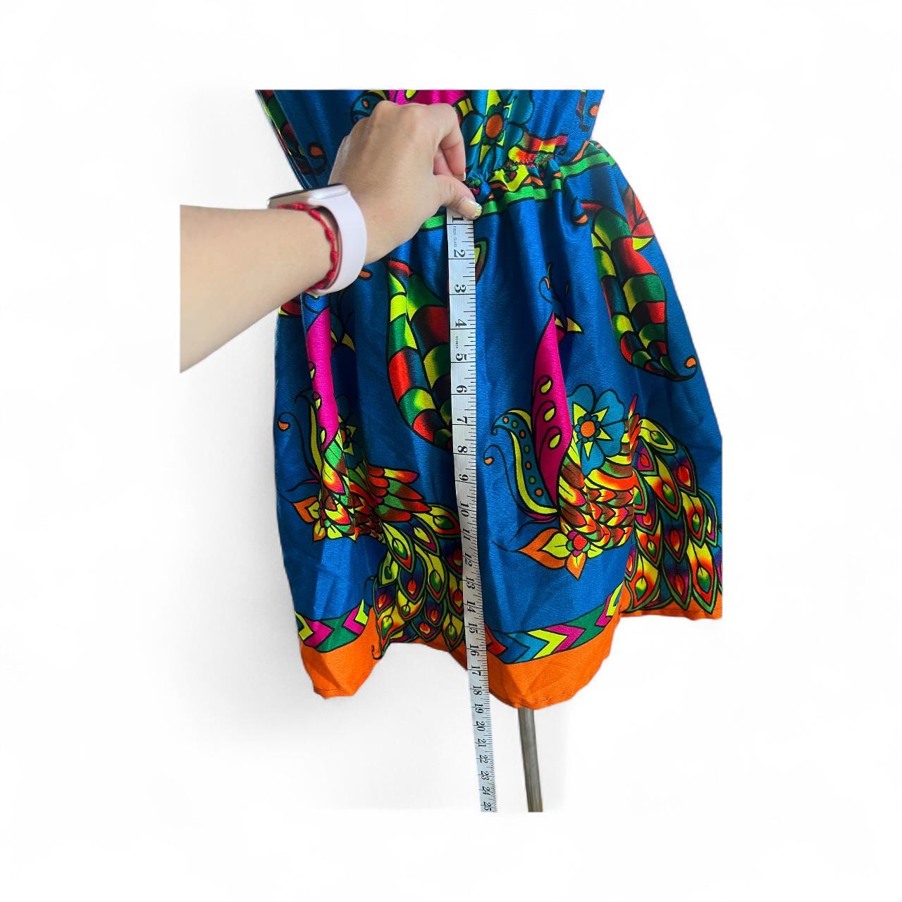 The stunning royal-blue base is adorned with colorful peacock motifs and intricate geometric borders — symbols of pride and creativity in Embera tradition. Lightweight, soft, and comfortable, this dress brings heritage to life through every detail.