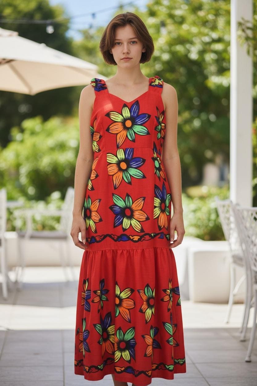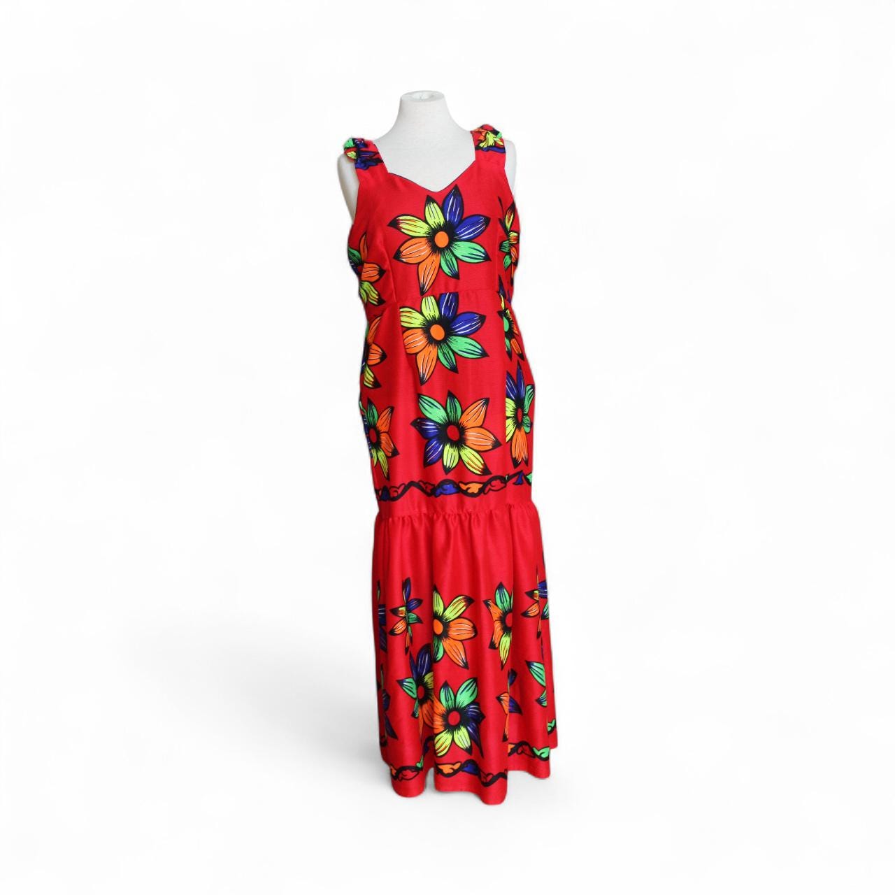 Bring vibrant culture and elegance into your wardrobe with this stunning handmade red Paruma dress, crafted using authentic Paruma fabric traditionally by the Indigenous Embera Wounaan women of Panama.
