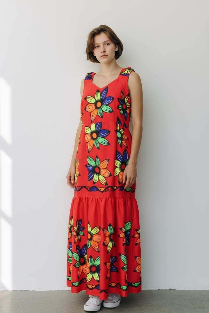 This dress is truly special — every piece of Paruma fabric is unique, featuring bold colors and symbolic floral patterns that represent nature, strength, and ancestral artistry.