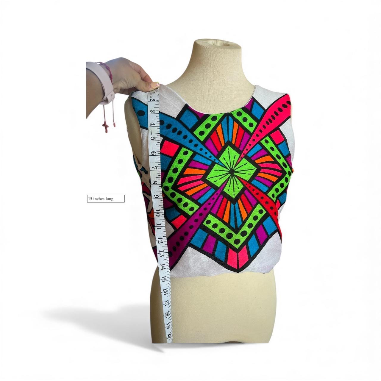 This design features a rare geometric Paruma pattern with vibrant neon colors that pop beautifully against the white base. Each piece of Paruma is one-of-a-kind, making this top a stunning blend of culture, art, and modern style.