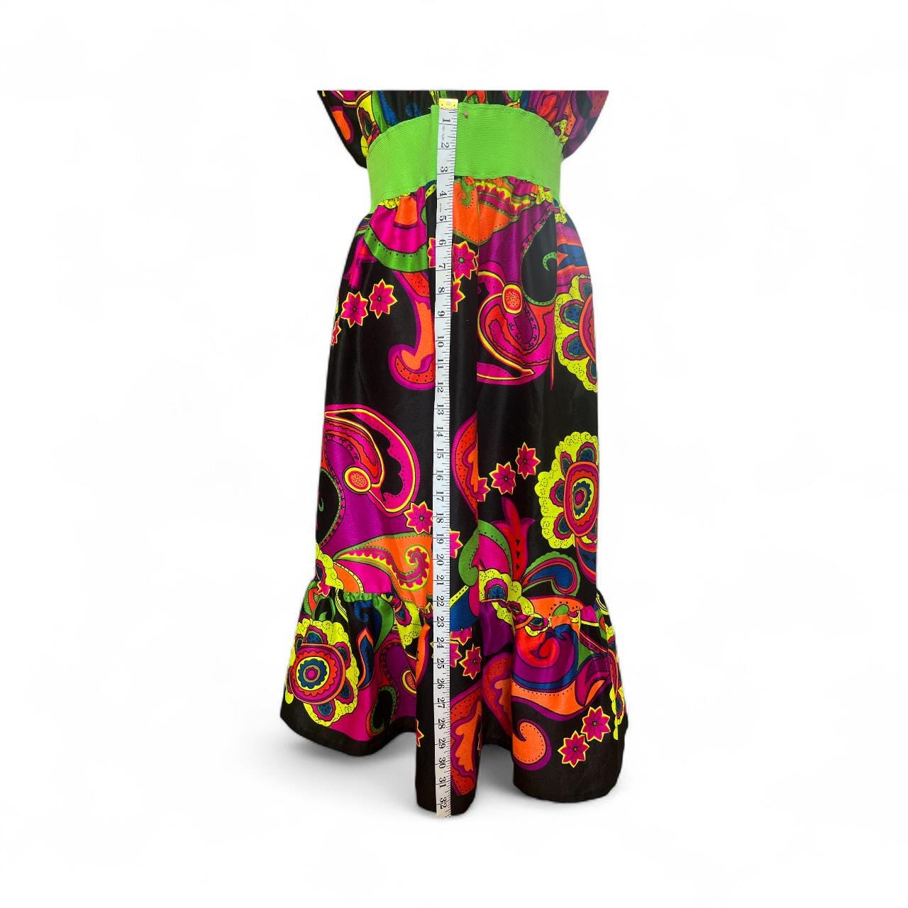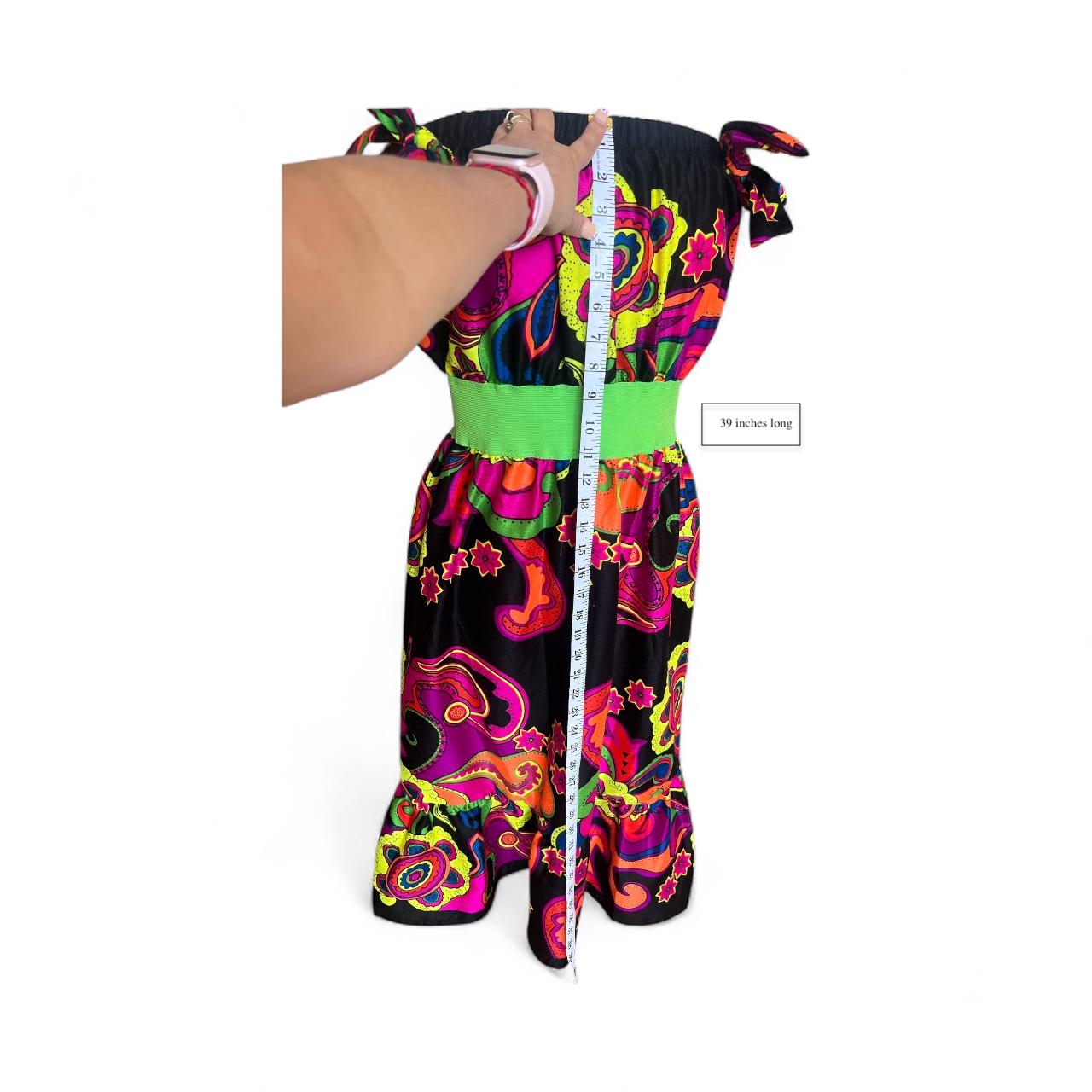 This design features a deep black base filled with bright neon floral and swirl motifs that create a dramatic, artistic look. The off-shoulder neckline and tie straps add a feminine touch, while the bright green waistband shapes and defines the silhouette perfectly.